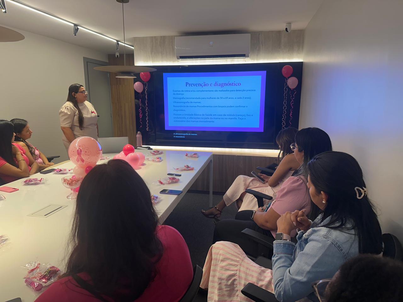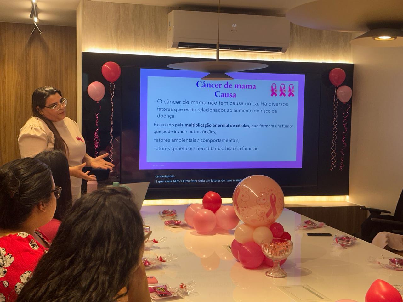 A ação contou com uma palestra conduzida pela enfermeira Deborah Cristina, que abordou de forma leve e informativa a importância da prevenção e do diagnóstico precoce do câncer de mama, além de reforçar a necessidade do cuidado contínuo com a saúde da mulher.