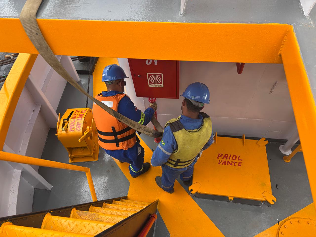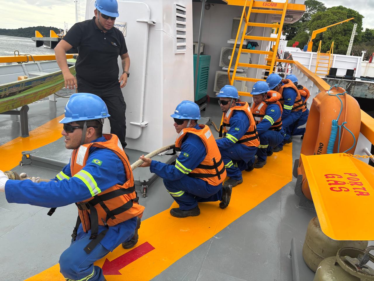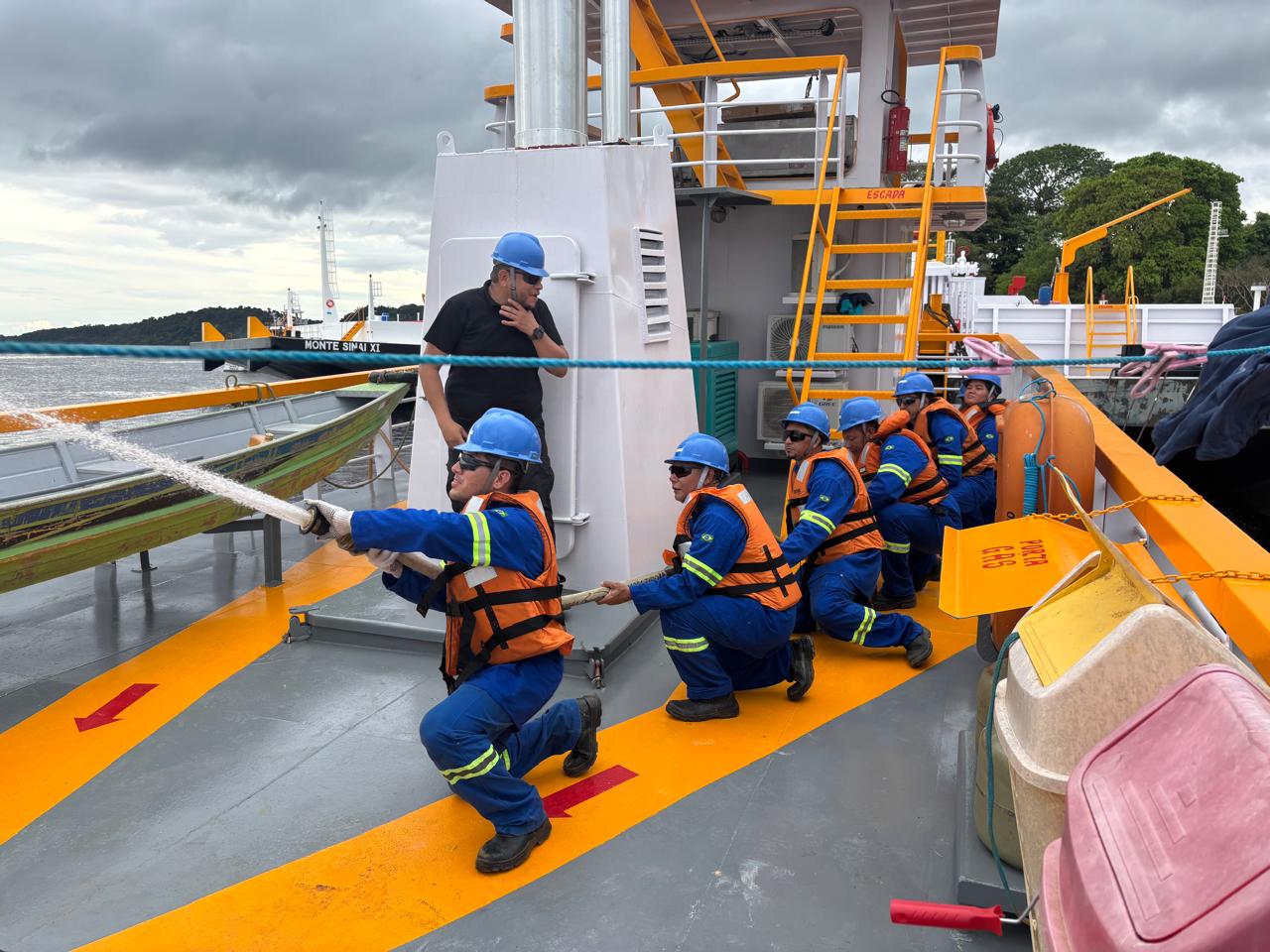 Durante o treinamento, foram abordadas técnicas de controle de incêndio, evacuação segura, manuseio de equipamentos e uso correto dos EPIs (Equipamentos de Proteção Individual). A atividade também inclui simulações práticas, que reproduziram possíveis cenários reais em embarcações e áreas operacionais.